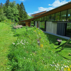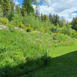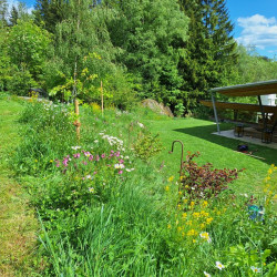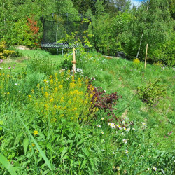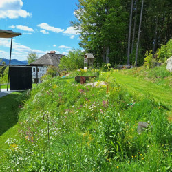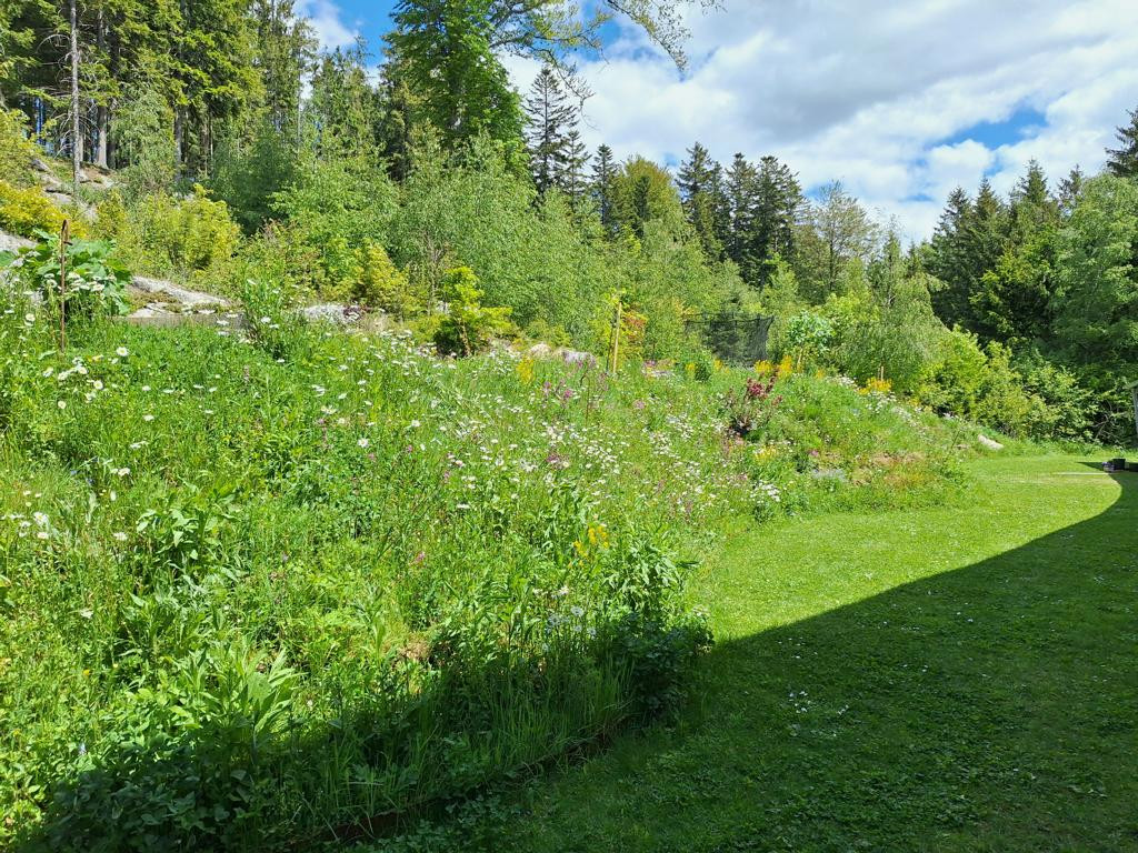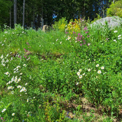 Die Böschung grenzt direkt an den Wald und soll sich harmonisch in die Landschaft fügen - und wenig Arbeit machen. Eine monotone Bepflanzung mit einem Bodendecker allein wird ausgeschlossen. Es soll spannend sein, man soll die Natur erleben können von innen! Und für Insekten soll es etwas sein!