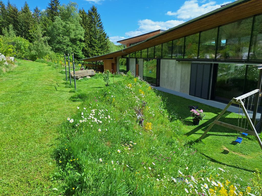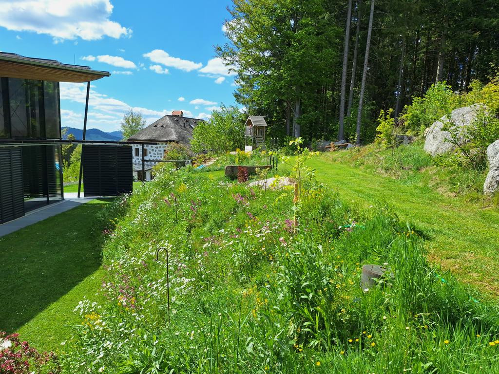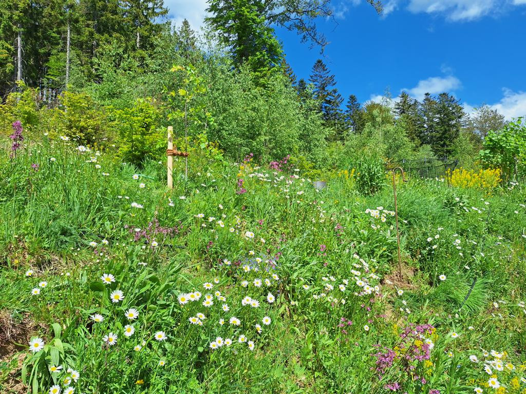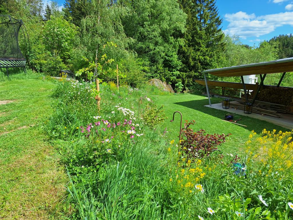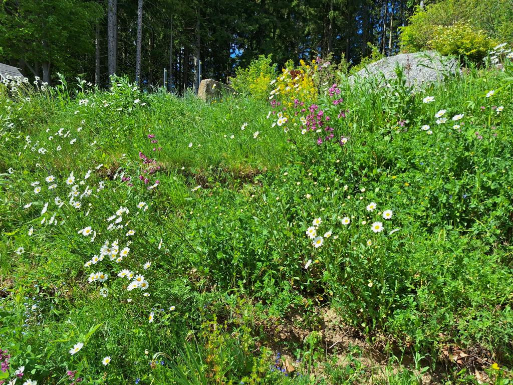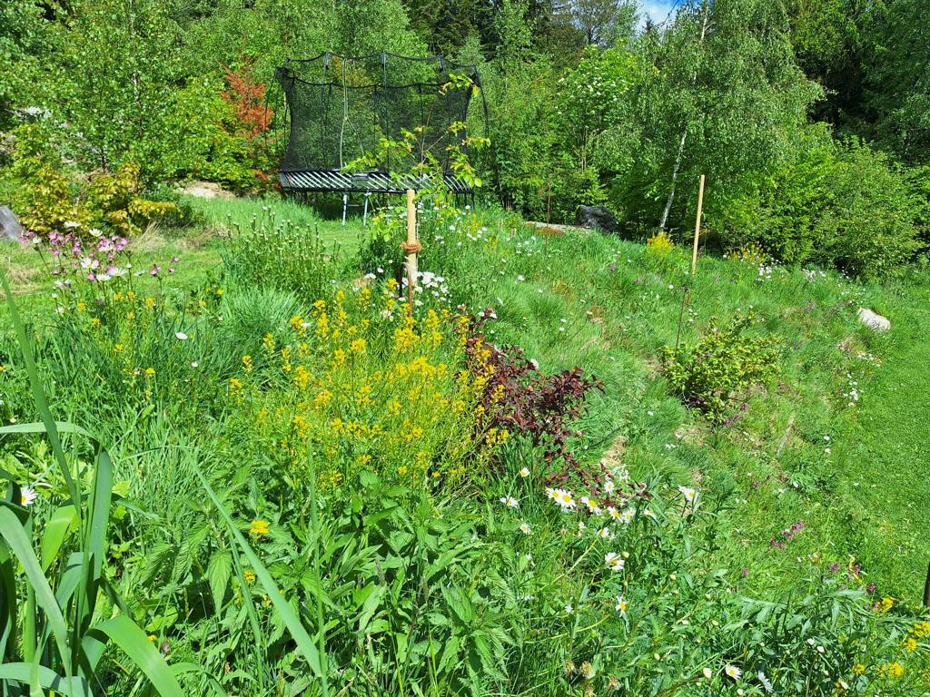 Was ich daraus gelernt habe: Als Kunde muss man sehr beharrlich an die Vision „Blumenwiese“ glauben und darauf vertrauen, da die besuchende Umgebung anfangs meint, man müsste doch die Böschung jäten, es wüchse zuviel Gras, zuviel dies und zuviel das. Was Laien meist übersehen ist, dass eine Blumenwiese zu etwa 80% aus verschiedensten Gräsern besteht, Gras sehr schön ist und außerdem hervorragend Böschungen befestigt!